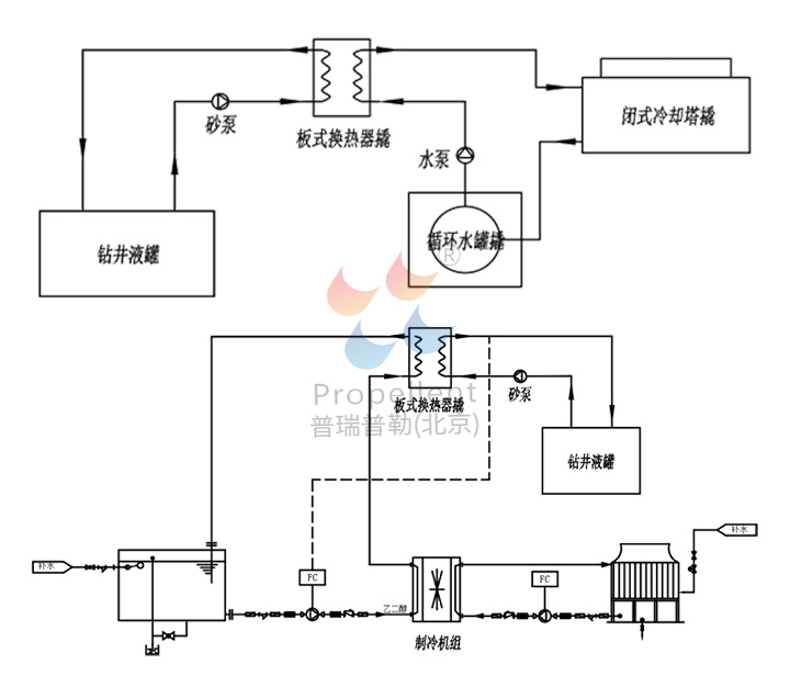 該系統(tǒng)提供兩種靈活的冷卻模式:一是通過空冷器利用自然風(fēng)冷卻循環(huán)水,再與鉆井液進(jìn)行熱交換;二是通過制冷機(jī)組制備冷凍水對鉆井液進(jìn)行強(qiáng)制降溫。
